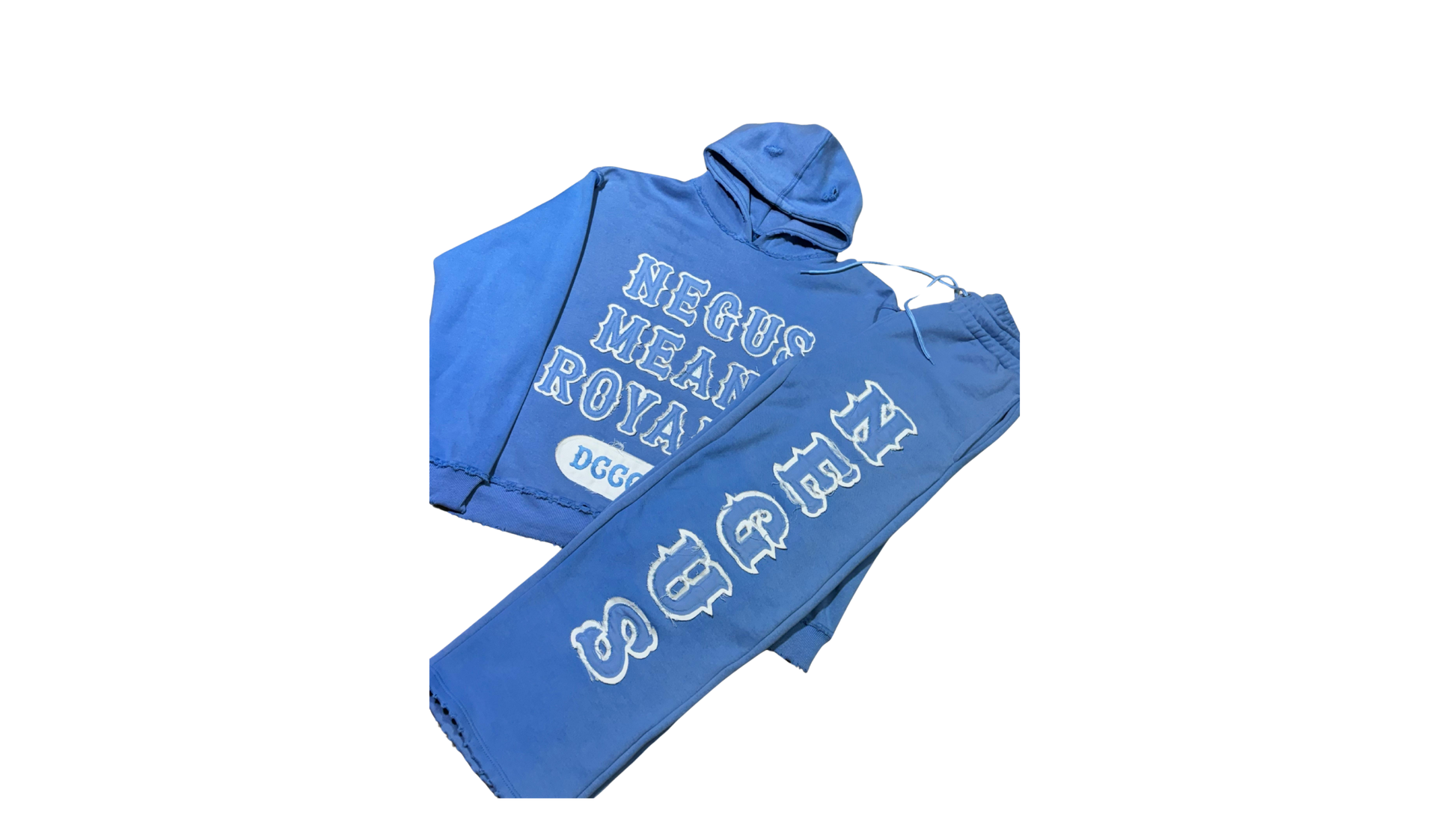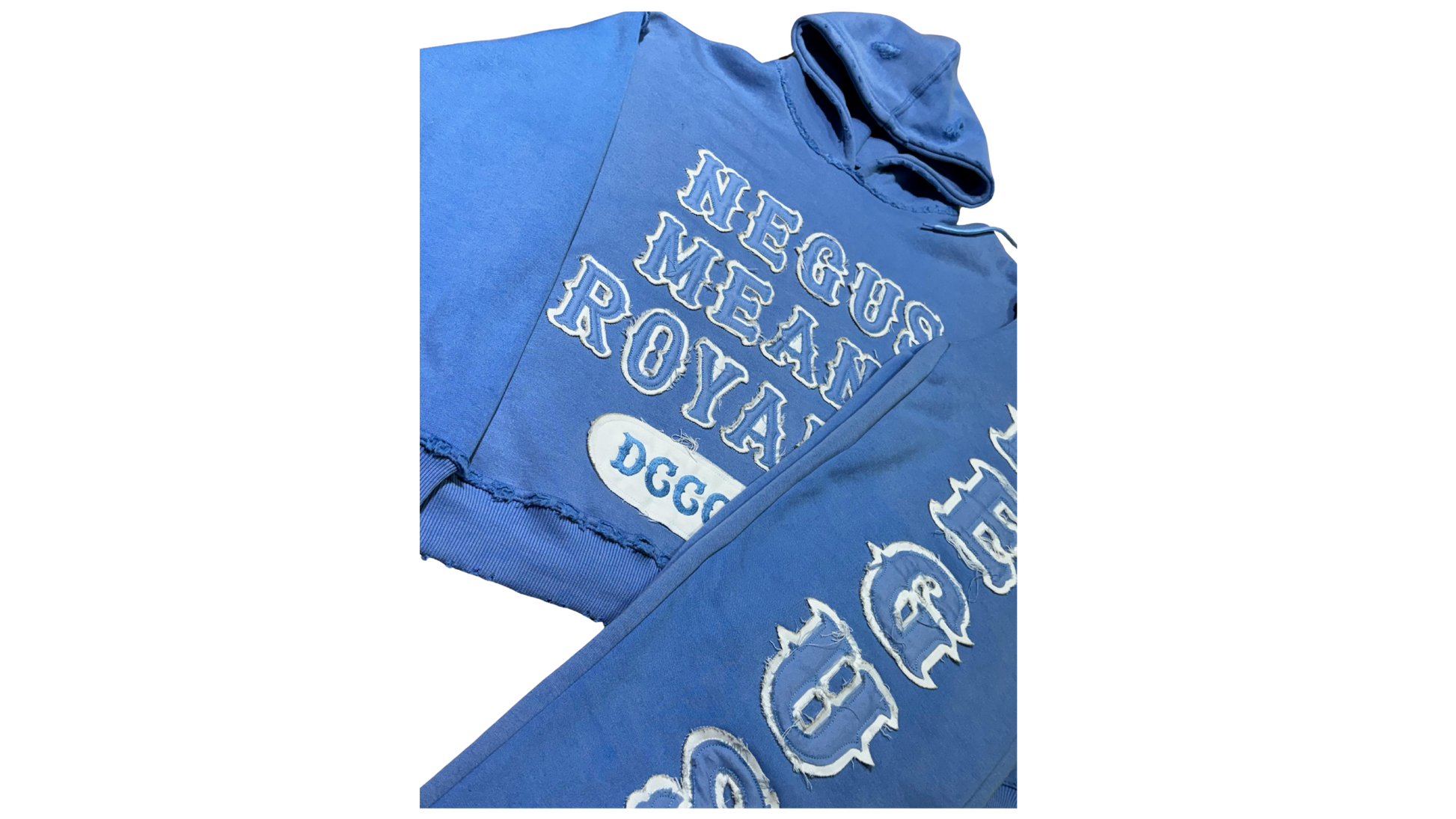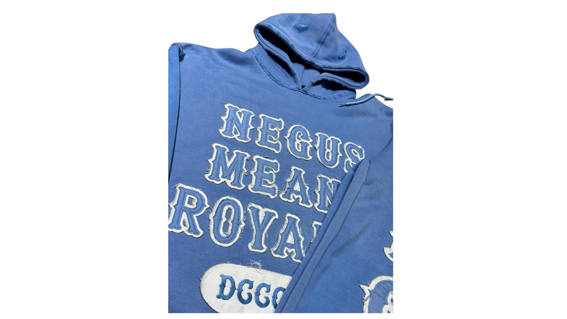 The Negus Means Royalty sweatsuit isn’t just fashion—it’s a reflection of legacy, power, and self-worth. Every distressed detail and bold appliqué lettering is a reminder that greatness isn’t given; it’s earned, reclaimed, and worn with pride.