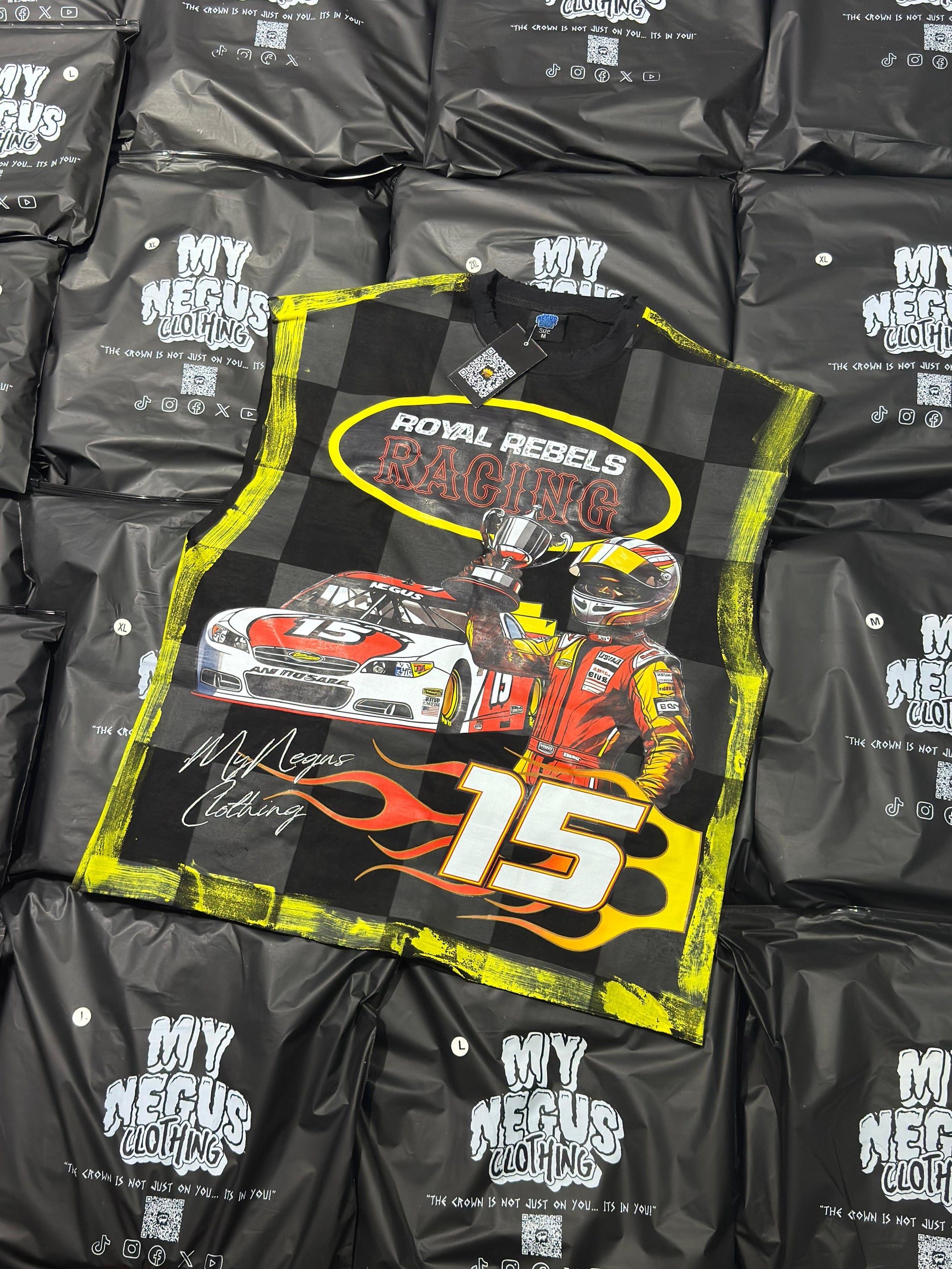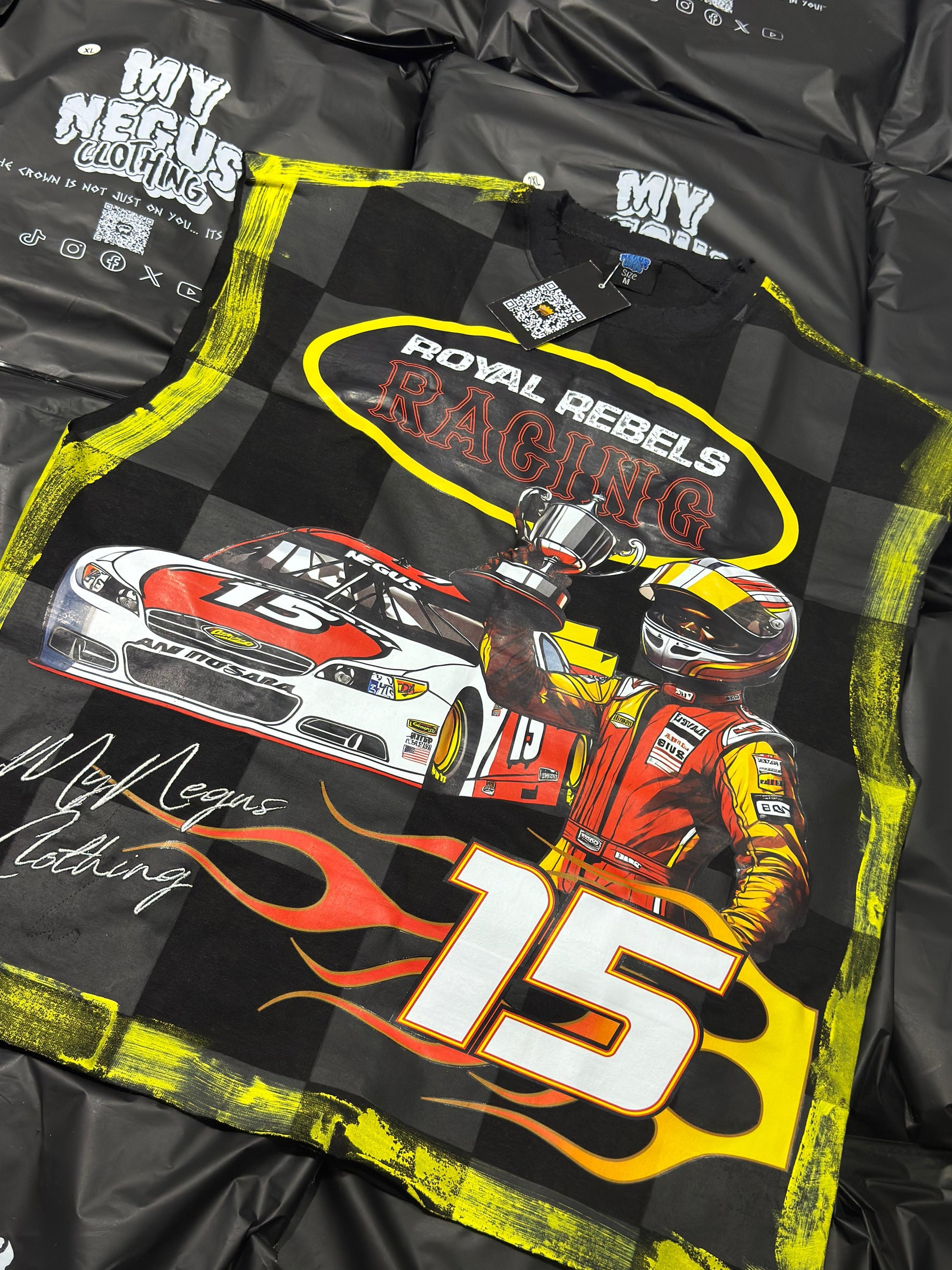 Screen-printed front graphic featuring the No. 15 car, champion trophy, and "Royal Rebels Racing" logo